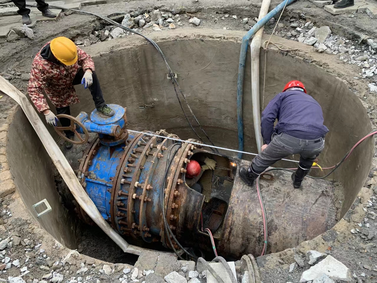 停水搶修主要包括廠站停泵、倒閥、排水、施工、沖洗、消毒、恢復(fù)供水等過(guò)程,供水管徑越大、輸水距離越長(zhǎng),總耗時(shí)越久。此處節(jié)點(diǎn)性閘閥為中心城區(qū)供水管網(wǎng)“大動(dòng)脈”,系主要輸水管線之一,DN1200管道的停水搶修波及范圍廣、排水時(shí)間長(zhǎng)、焊接難度大。為全力縮短停水時(shí)間,減少停水范圍,集團(tuán)多部門(mén)聯(lián)動(dòng),最大限度保障市民生產(chǎn)生活用水。