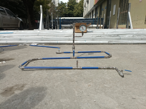 圖為技術(shù)人員正在對(duì)薄壁不銹鋼管道進(jìn)行打壓測(cè)試