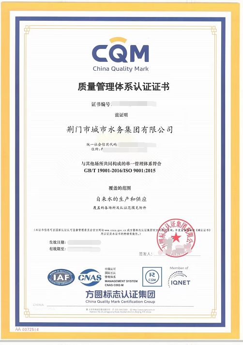 圖為市水務(wù)集團通過質(zhì)量管理體系認證