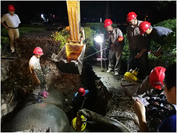 整個(gè)搶修工作安排在15日夜間11時(shí)至16日零晨6時(shí)進(jìn)行。由于爆管段位于掇刀區(qū)白石坡“白石”較多地段,機(jī)械開(kāi)挖到一定程度后,施工基坑內(nèi)管道底部只能用人工進(jìn)行掏挖,一度給搶修工作造成極大困難。在搶修人員帶水作業(yè)頑強(qiáng)奮戰(zhàn)、不斷努力下,經(jīng)過(guò)18個(gè)小時(shí)的晝夜搶修,在16日零晨4點(diǎn)搶修完畢,按市供水總公司對(duì)社會(huì)服務(wù)承諾時(shí)間,于早上6時(shí)如期恢復(fù)供水。